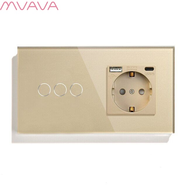 - Сенсорный выключатель с розеткой, USB и Type-C выходами 5 вольт 2.1А, предназначен для управления тремя линиями освещения, подключения нагрузки к розетке и зарядки электронных устройств. Для включения и выключения света вместо нажатия на механическую клавишу производится прикосновение к сенсорной зоне выключателя.