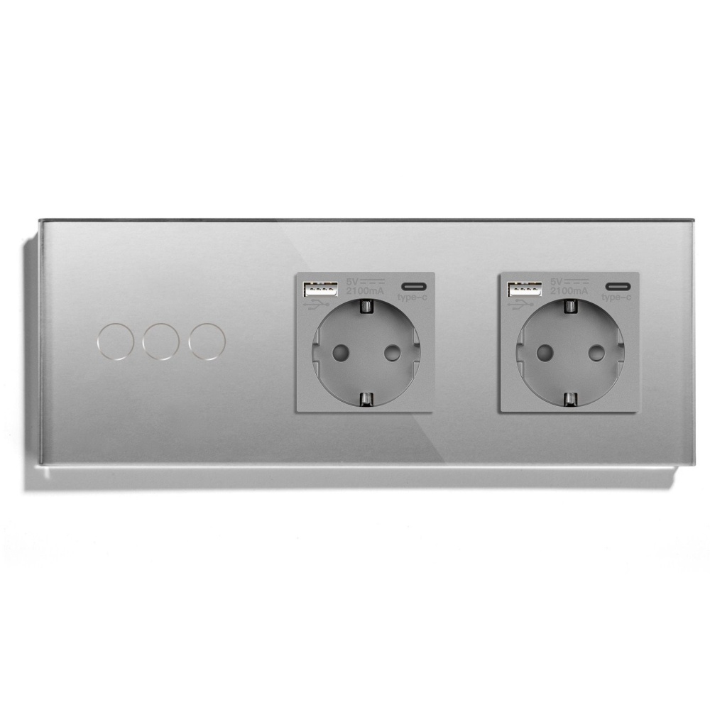 Сенсорный выключатель с розеткой 3кл. 2 розетки, 3 поста (3G+2AC) стекло 228х86мм цвет серый