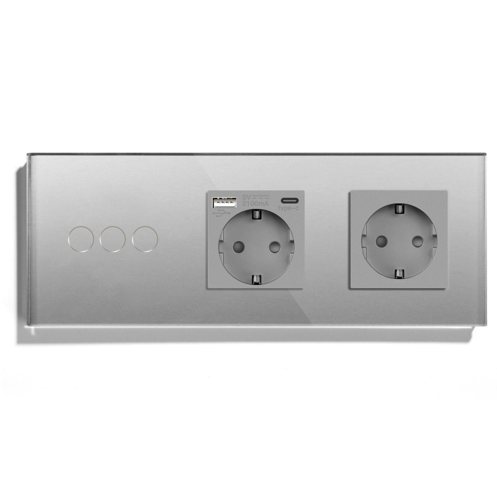 Сенсорный выключатель с розеткой 3кл. 2 розетки, 3 поста (3G+AC/EU) стекло 228х86мм цвет серый