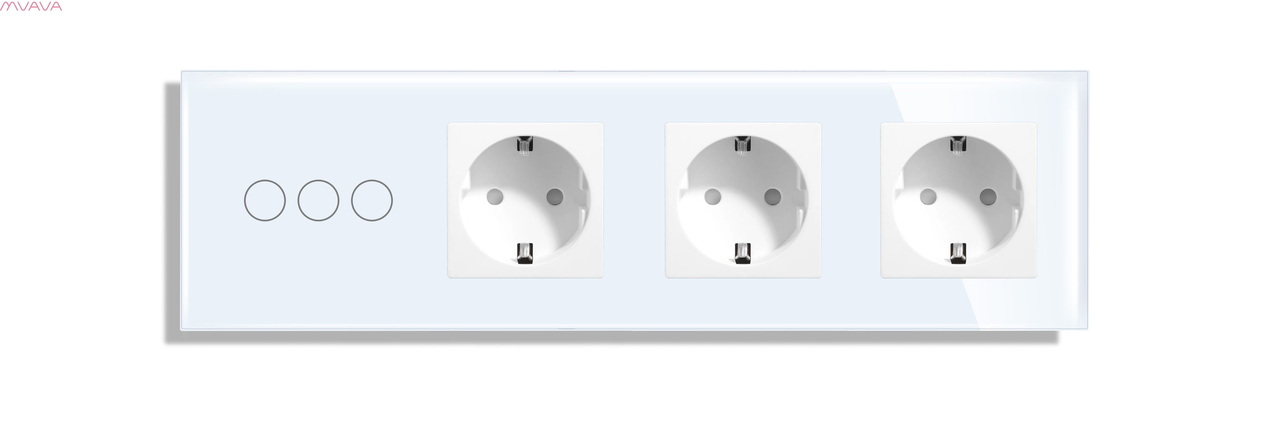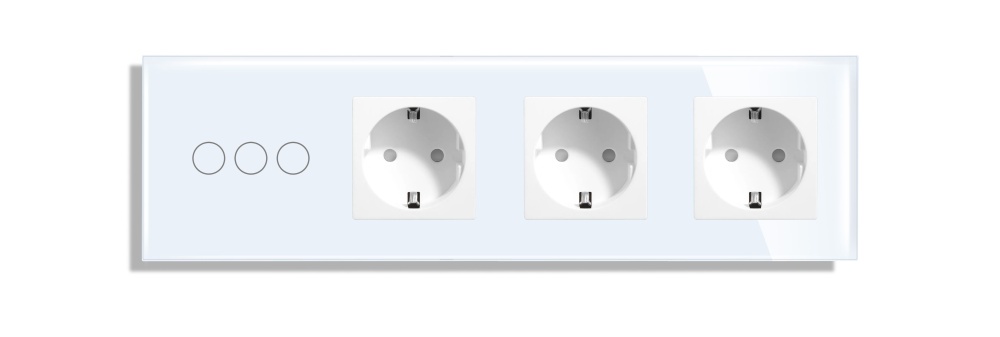 Сенсорный выключатель с розеткой 3кл. 3 розетки, 3 поста (3G+3EU) стекло 2.5D299х86мм цвет белый