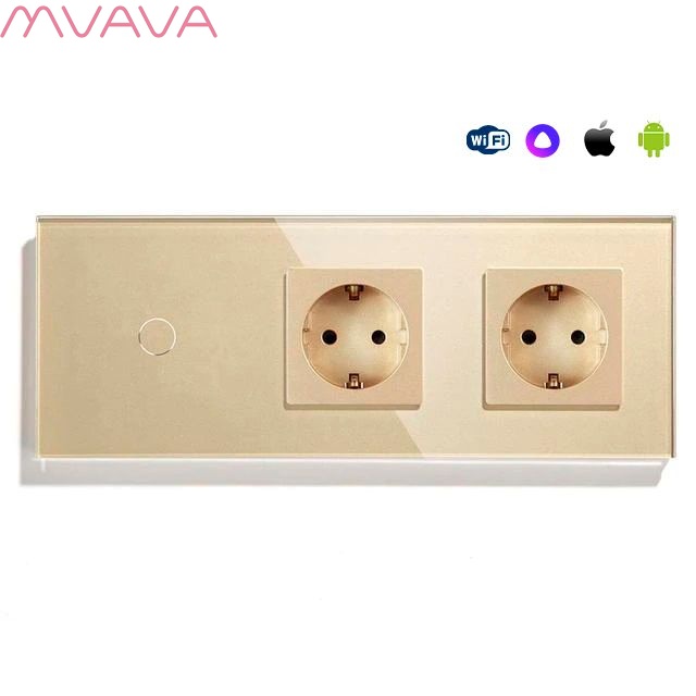 Сенсорный выключатель WiFi 1 клавиша 2 розетки 3 поста (1G+2EU) стекло 228х86мм цвет золотой