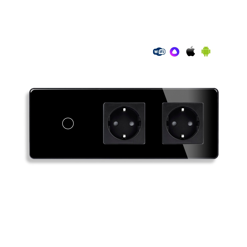 Сенсорный выключатель WiFi 1 клавиша 2 розетки 3 поста (1G+2EU) стекло 2.5D 228х86мм цвет черный