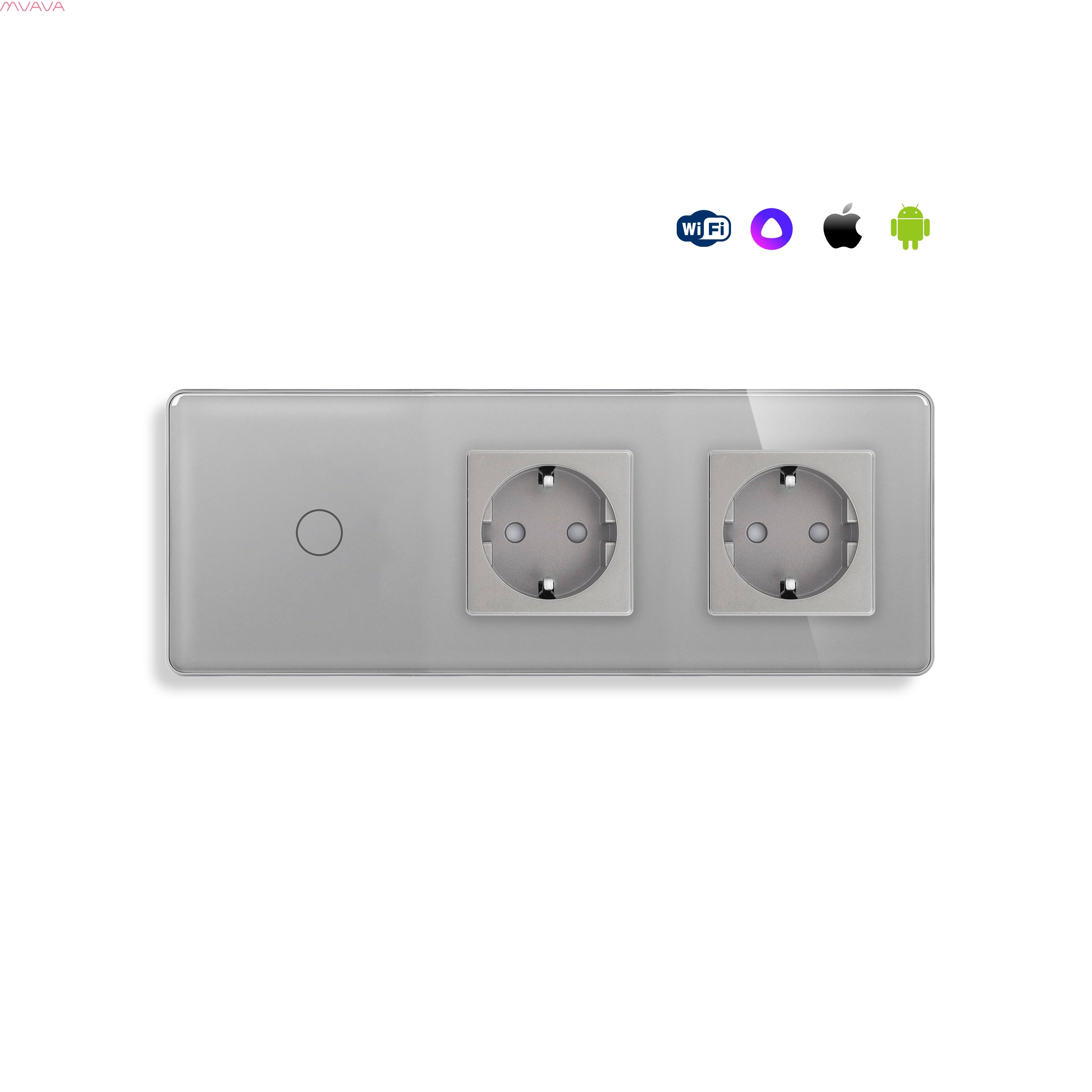 Сенсорный выключатель WiFi 1 клавиша 2 розетки 3 поста (1G+2EU) стекло 2.5D 228х86мм цвет серый