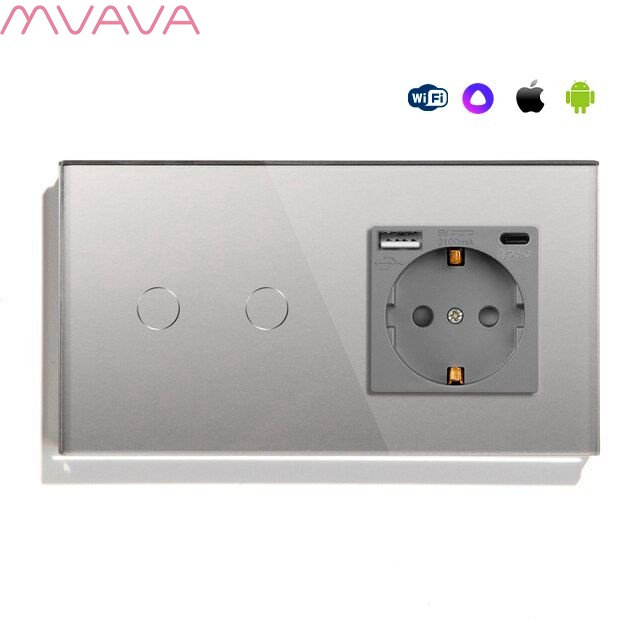 Сенсорный выключатель WiFi 2 клавиши 1 розетка 2 поста (2G+1AС) стекло 157х86мм цвет серый