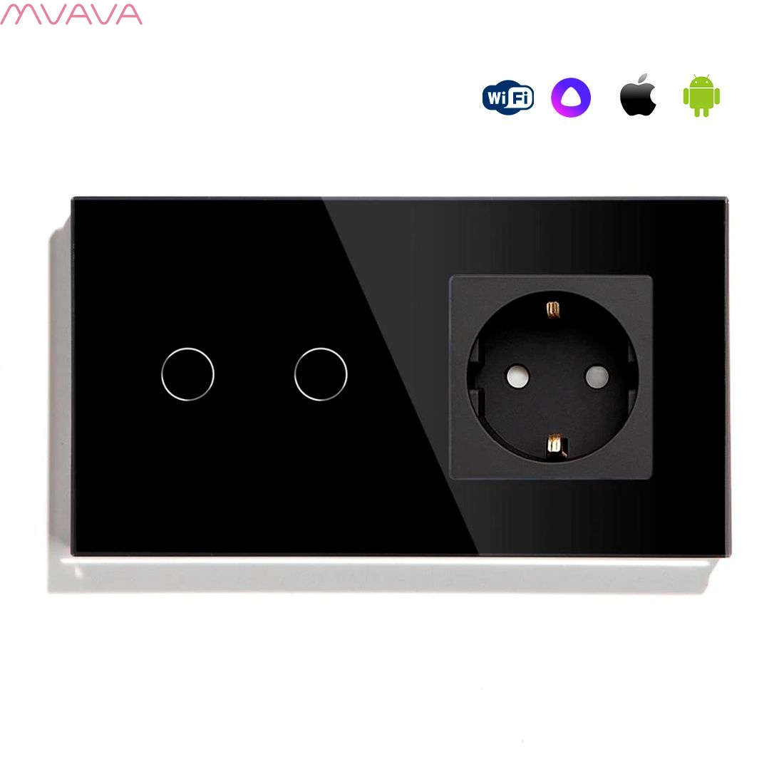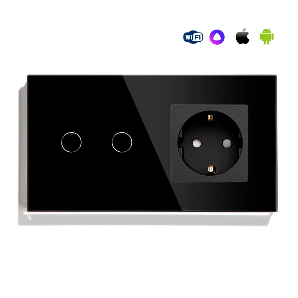 Сенсорный выключатель WiFi 2 клавиши 1 розетка 2 поста (2G+1EU) стекло 157х86мм цвет черный
