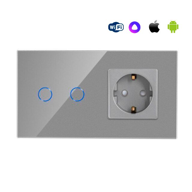 Сенсорный выключатель WiFi 2 клавиши 1 розетка 2 поста (2G+1EU) стекло 157х86мм цвет серый