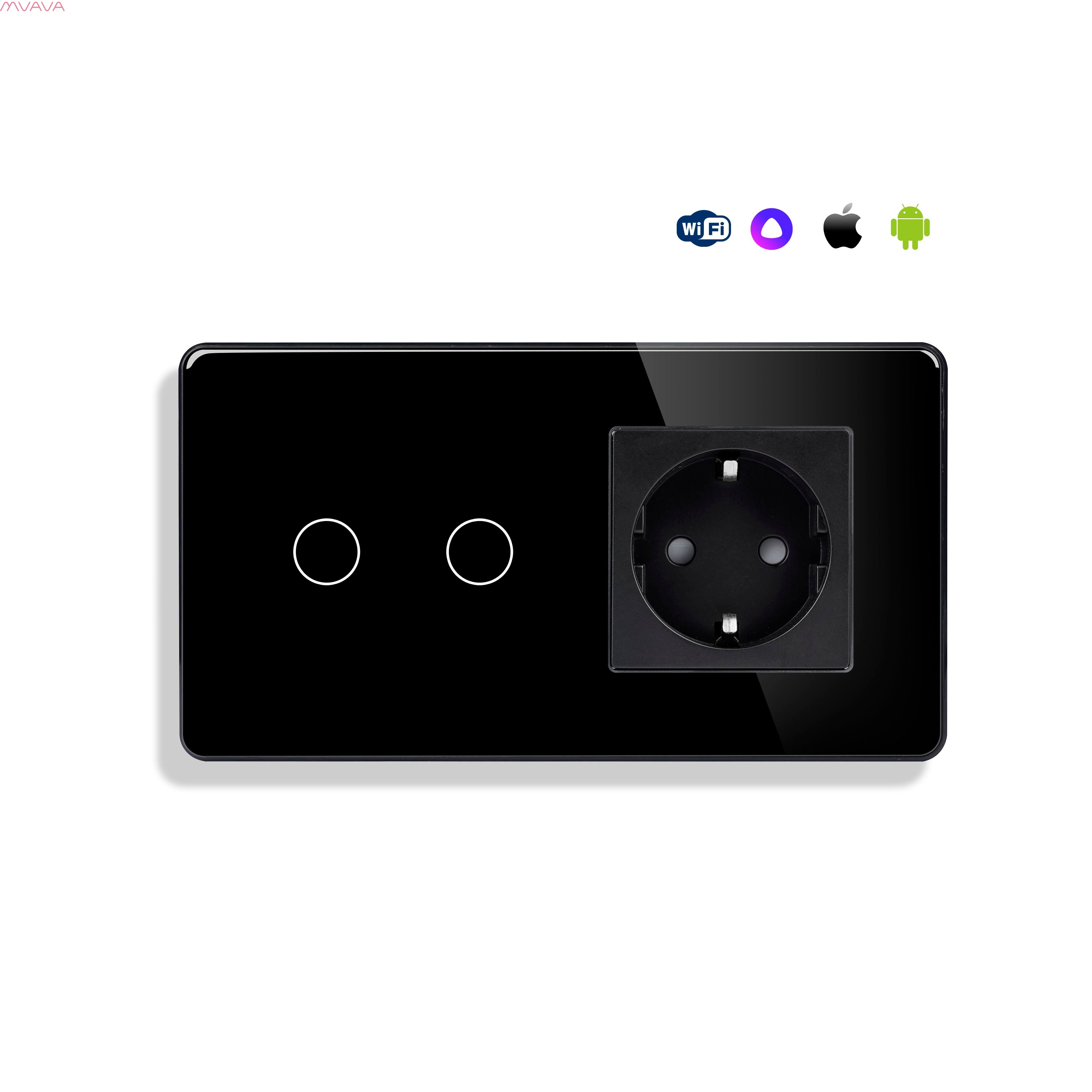 Сенсорный выключатель WiFi 2 клавиши 1 розетка 2 поста (2G+1EU) стекло 2.5D 157х86мм цвет черный