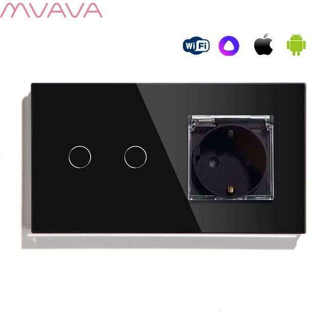 Сенсорный выключатель WiFi 2 клавиши 1 розетка IP44 2 поста (2G+EU) стекло 157х86мм цвет черный