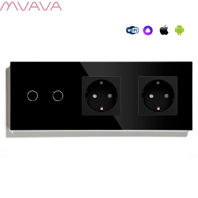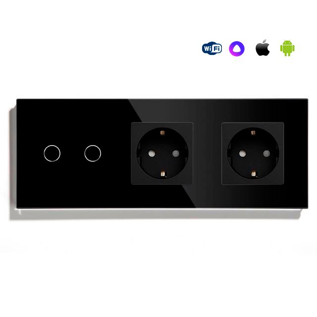 Сенсорный выключатель WiFi 2 клавиши 2 розетки 3 поста (2G+2EU) стекло 228х86мм цвет черный