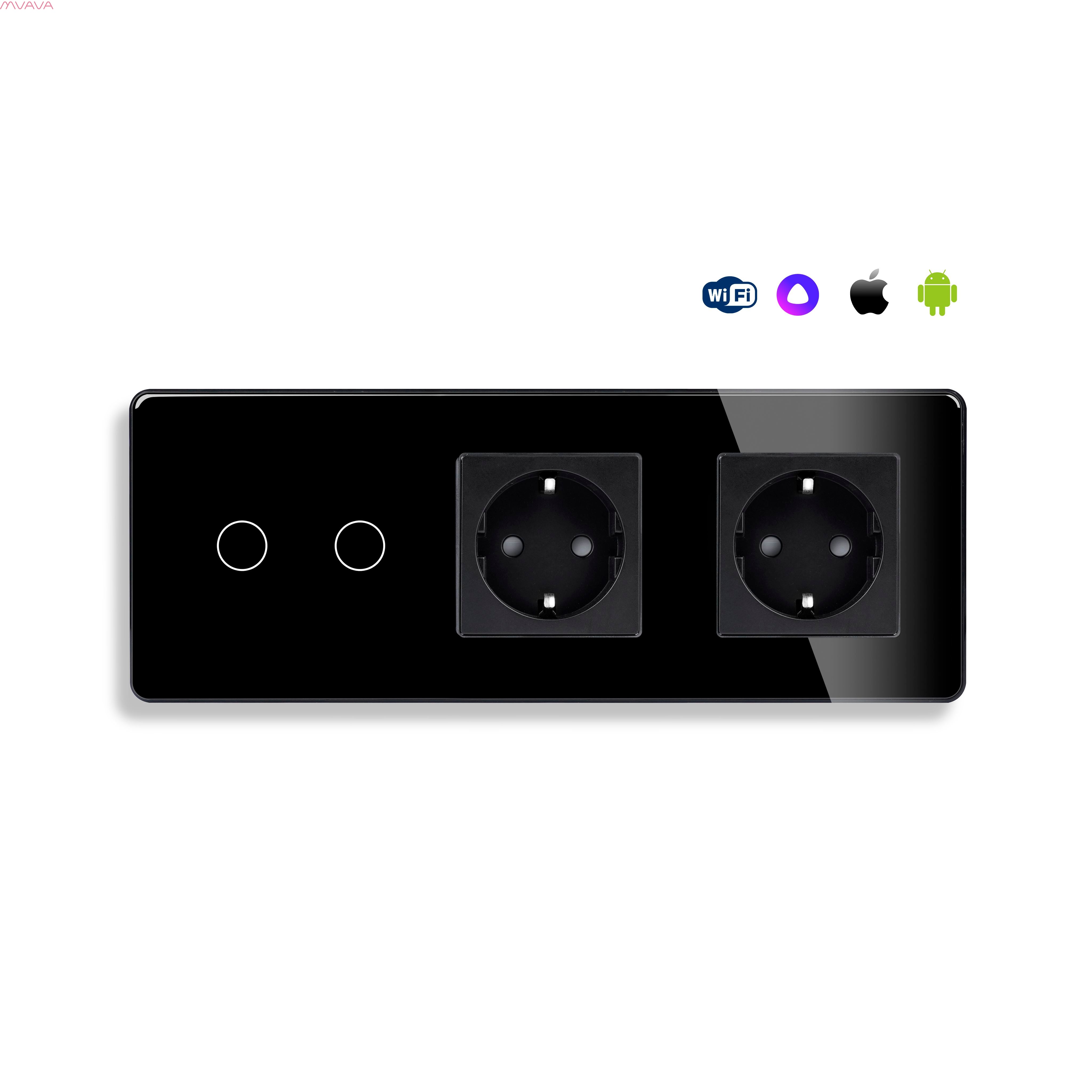 Сенсорный выключатель WiFi 2 клавиши 2 розетки 3 поста (2G+2EU) стекло 2.5D 228х86мм цвет черный