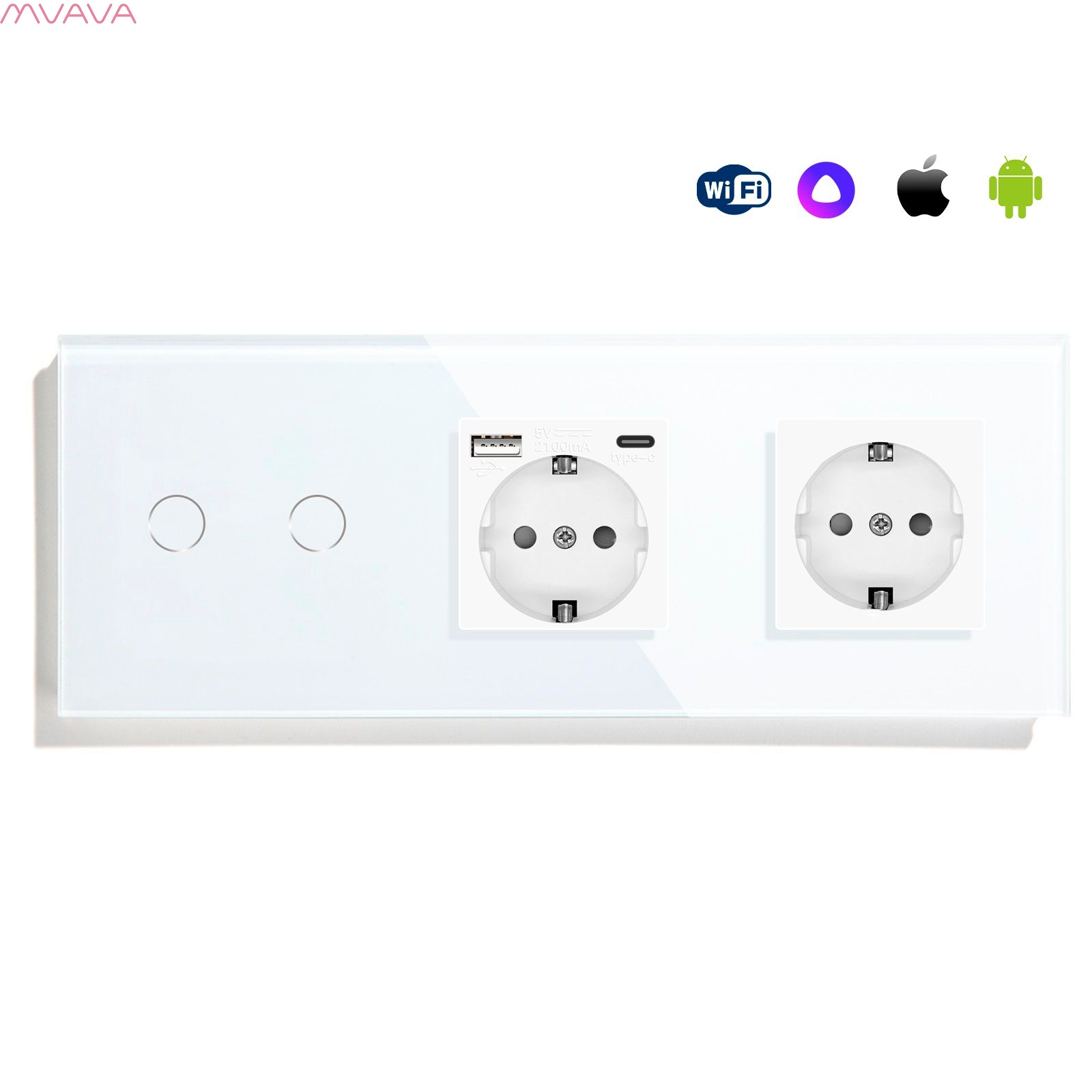 Сенсорный выключатель WiFi 2 клавиши 2 розетки 3 поста (2G+AC/EU) стекло 228х86мм цвет белый