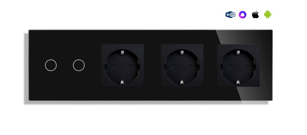 Сенсорный выключатель WiFi 2 клавиши 3 розетки 3 поста (2G+3EU) стекло299х86мм цвет черный