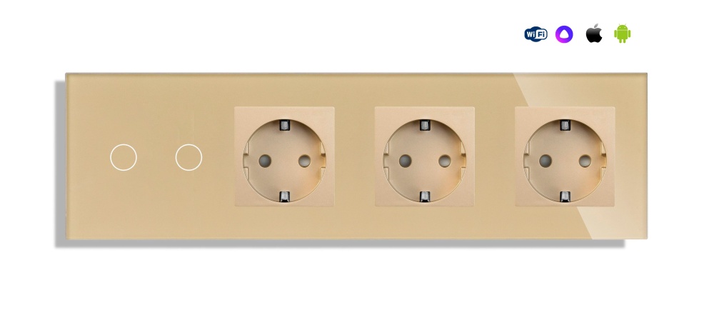Сенсорный выключатель WiFi 2 клавиши 3 розетки 3 поста (2G+3EU) стекло299х86мм цвет золотой