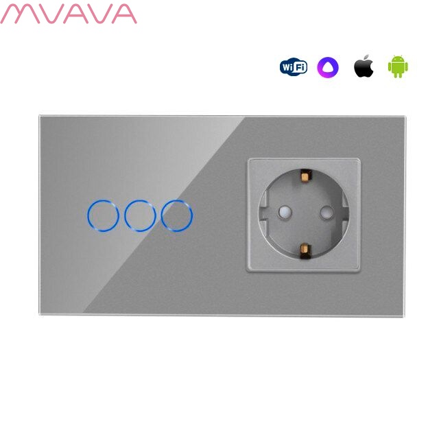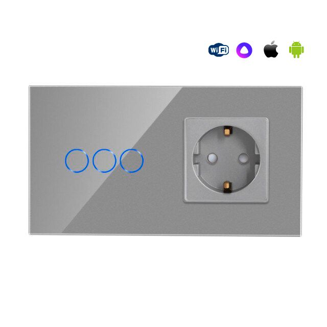 Сенсорный выключатель WiFi 3 клавиши 1 розетка 2 поста (3G+1EU) стекло 157х86мм цвет серый