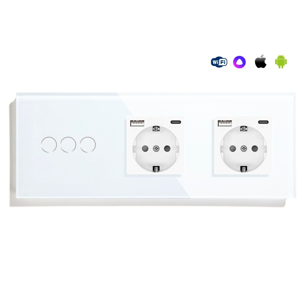 Сенсорный выключатель WiFi 3 клавиши 2 розетки 3 поста (3G+2AC) стекло 228х86мм цвет белый