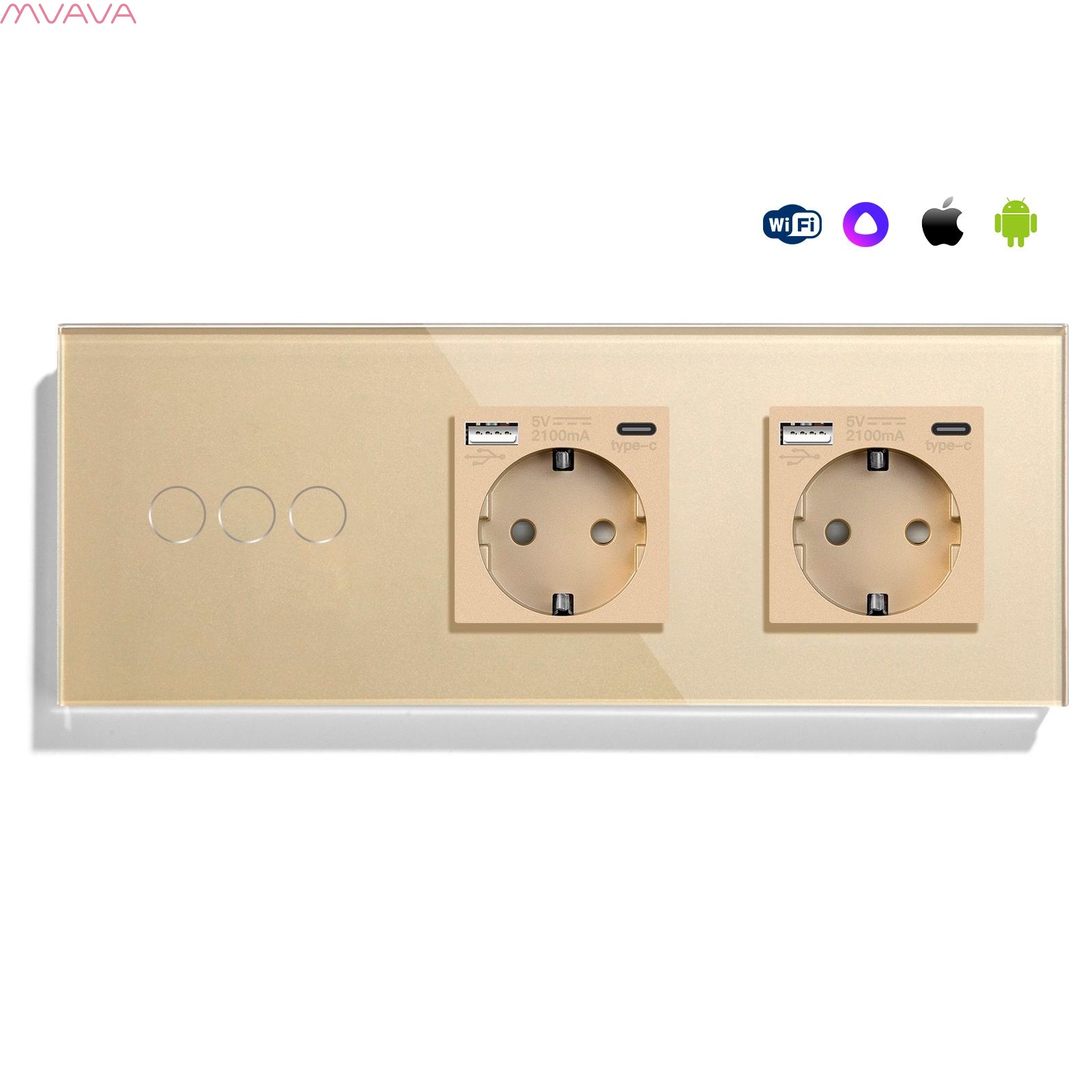 Сенсорный выключатель WiFi 3 клавиши 2 розетки 3 поста (3G+2AC) стекло 228х86мм цвет золотой