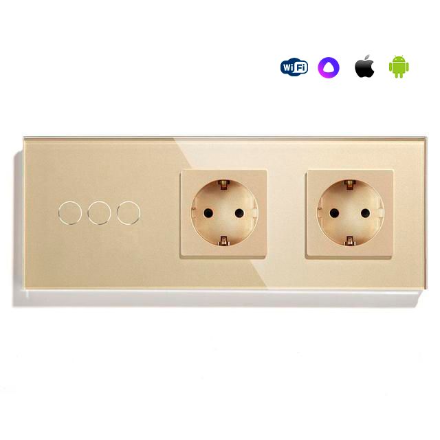 Сенсорный выключатель WiFi 3 клавиши 2 розетки 3 поста (3G+2EU) стекло 228х86мм цвет золотой