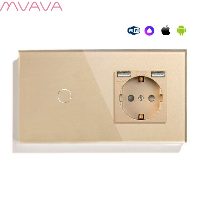 Сенсорный выключатель WiFi с нулем 1кл. 1розетка 2поста (1G+1AA) стекло 157х86мм цвет золотой
