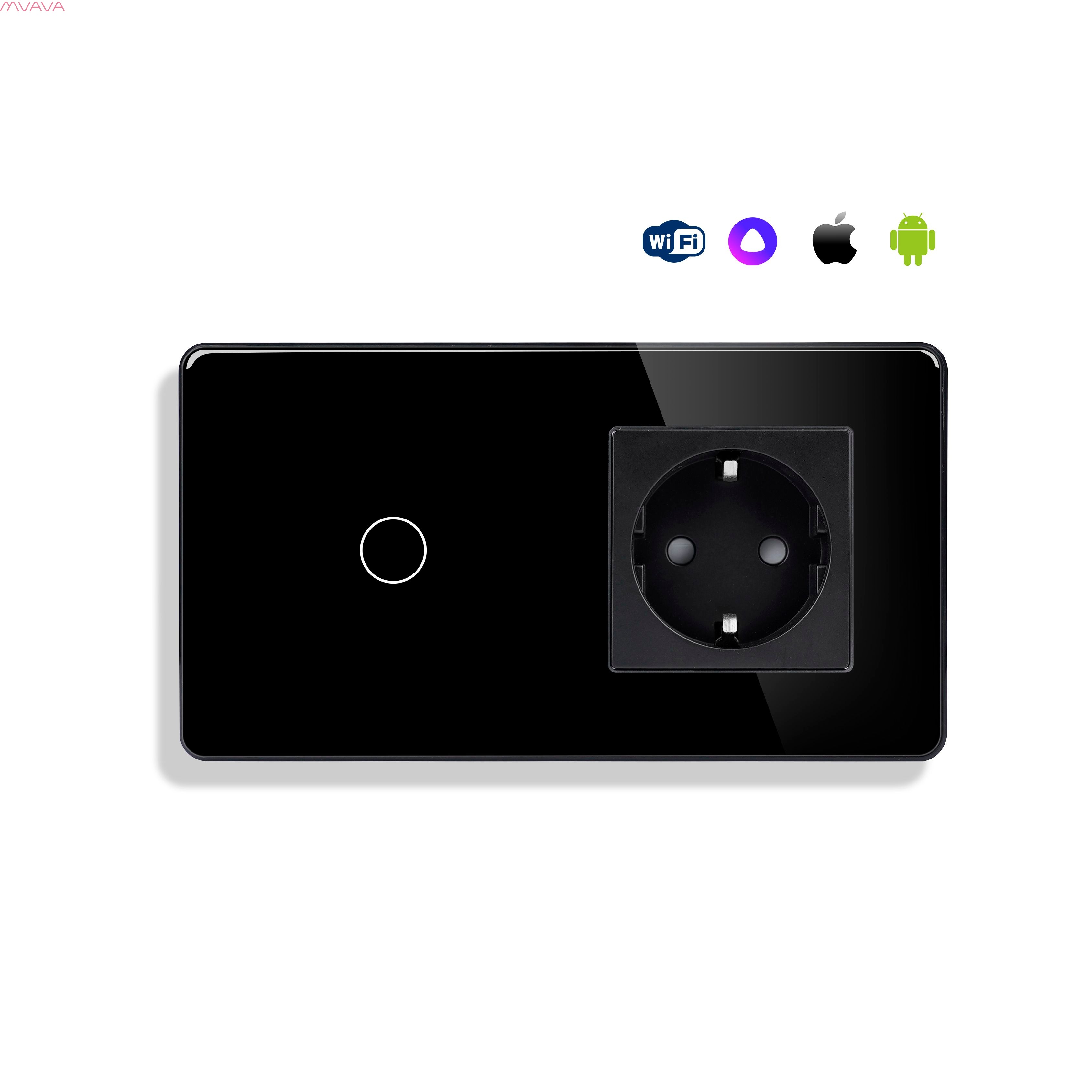 Сенсорный выключатель WiFi с нулем 1кл. 1розетка 2поста (1G+1EU) стекло 2.5D 157х86мм цвет черный