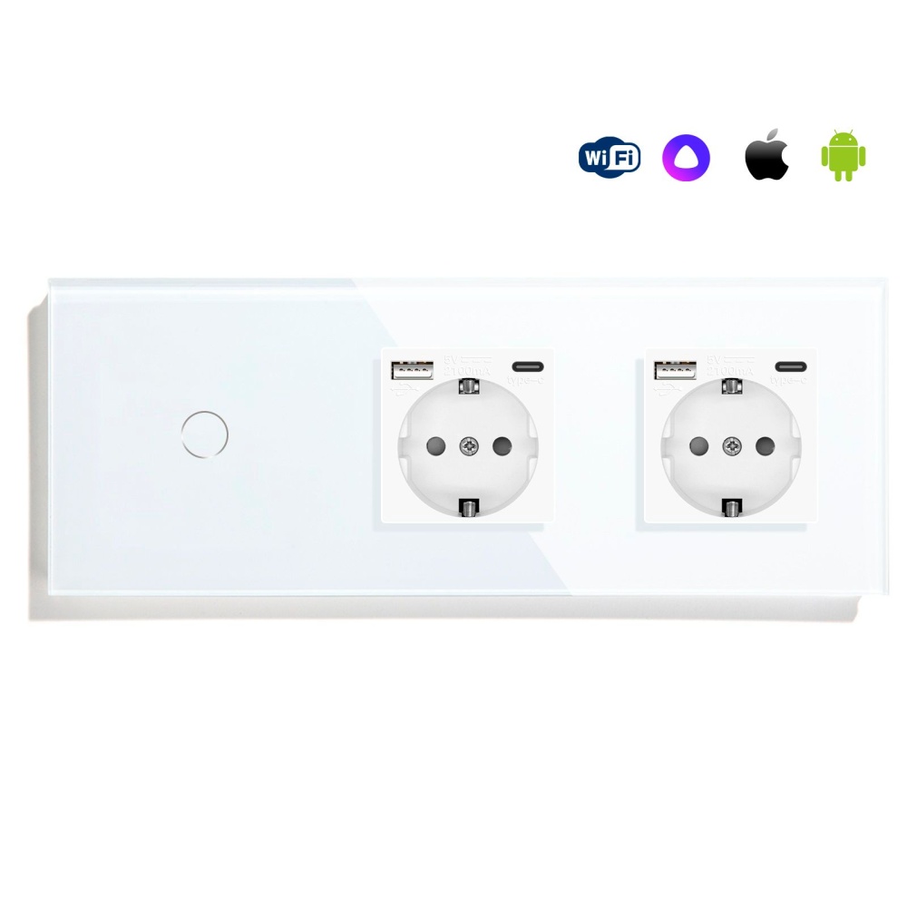 Сенсорный выключатель WiFi с нулем 1кл. 2розетки 3поста (1G+2AC) стекло 228х86мм цвет белый