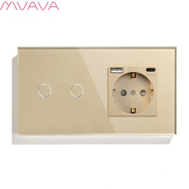Сенсорный выключатель WiFi с нулем 1розетка 2кл. 2поста (1AС+2G) стекло 157х86мм цвет золотой