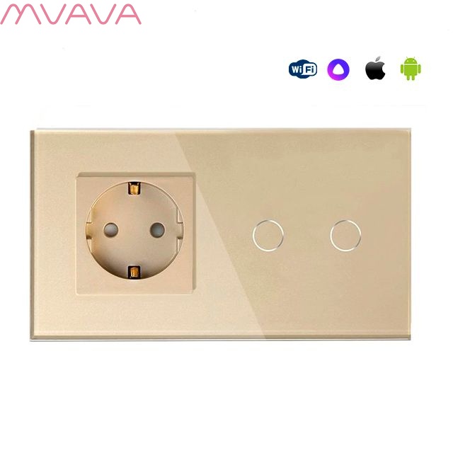 Сенсорный выключатель WiFi с нулем 1розетка 2кл. 2поста (1EU+2G) стекло 157х86мм цвет золотой