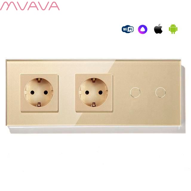 Сенсорный выключатель WiFi с нулем 2розетки 2кл. 3поста (2EU+2G) стекло 228х86мм цвет золотой