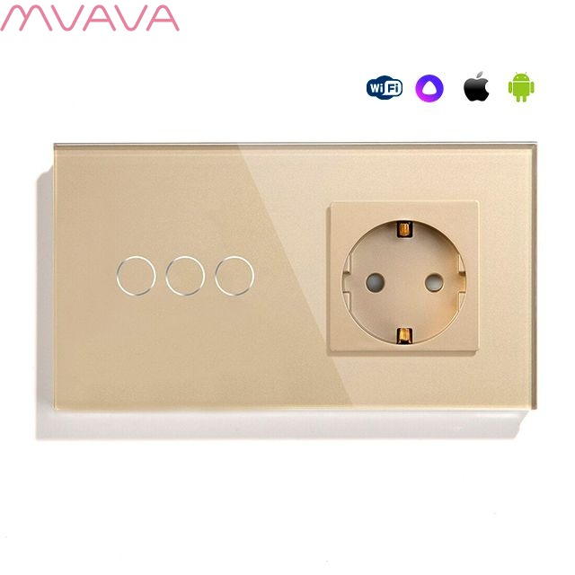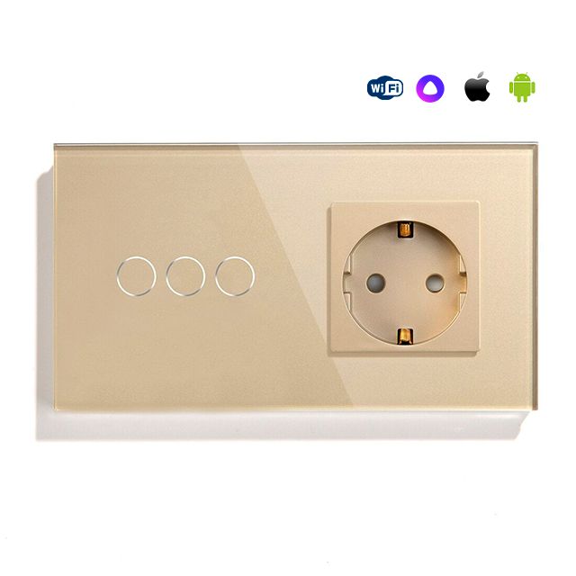 Сенсорный выключатель WiFi с нулем 3кл. 1розетка 2поста (3G+1EU) стекло 157х86мм цвет золотой
