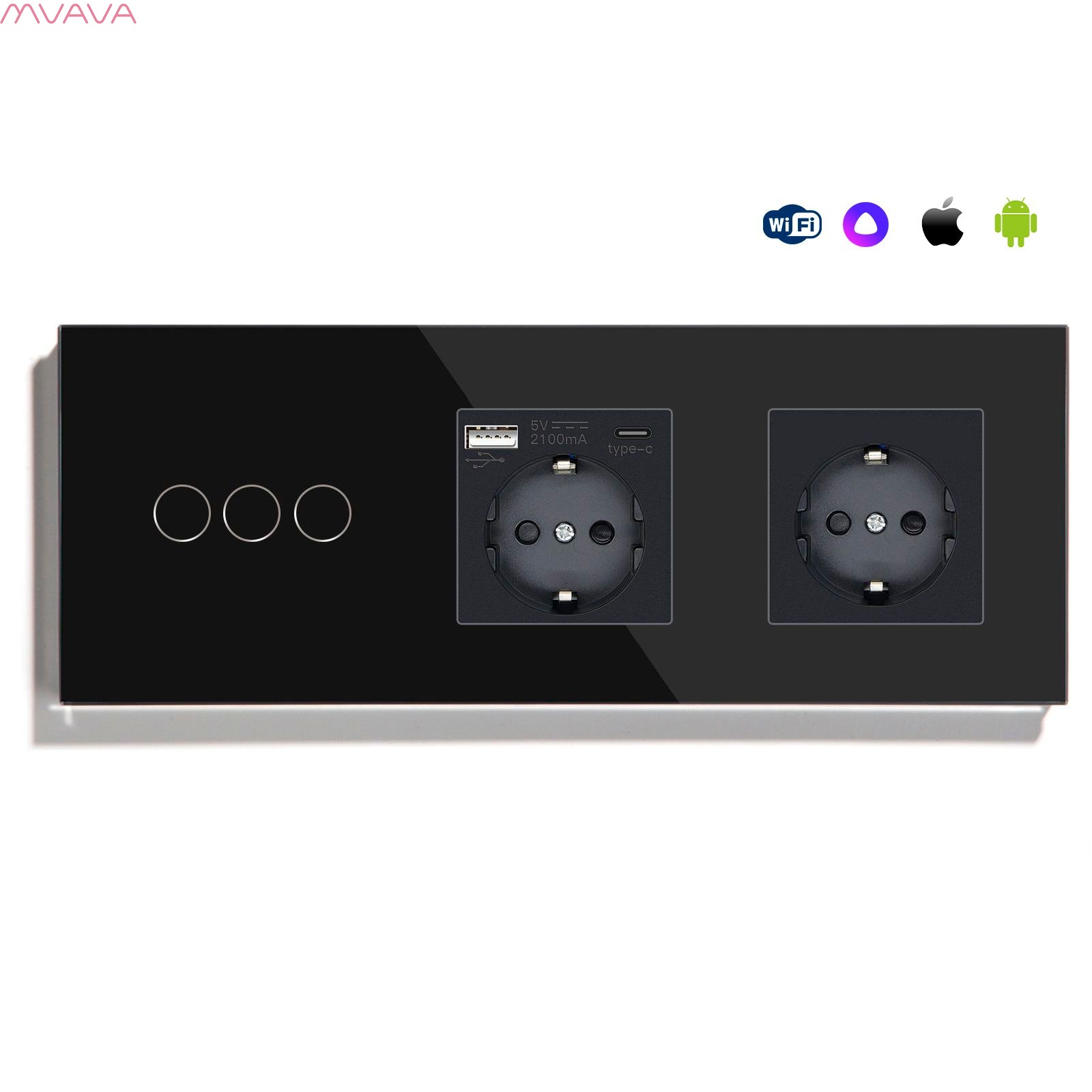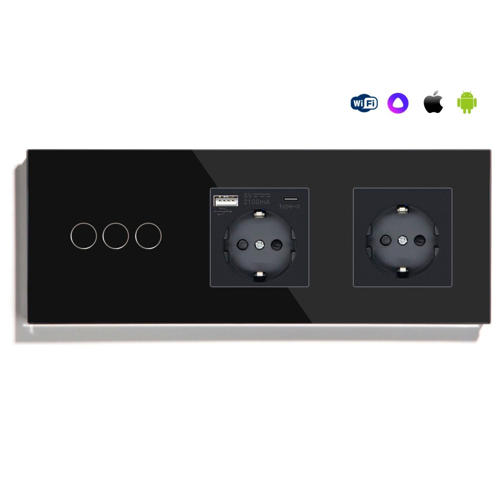 Сенсорный выключатель WiFi с нулем 3кл. 2розетки 3поста (3G+AC/EU) стекло 228х86мм цвет черный