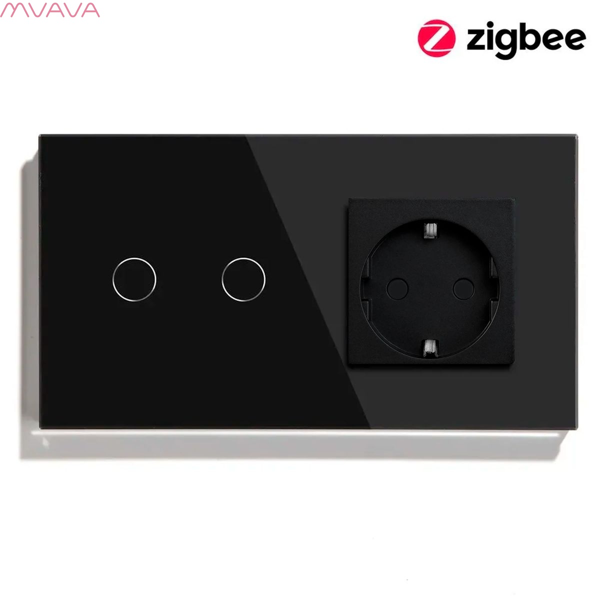 Сенсорный выключатель ZigBee 2кл. 1 розетка, 2 поста (2G+1EU) стекло 157х86мм цвет черный