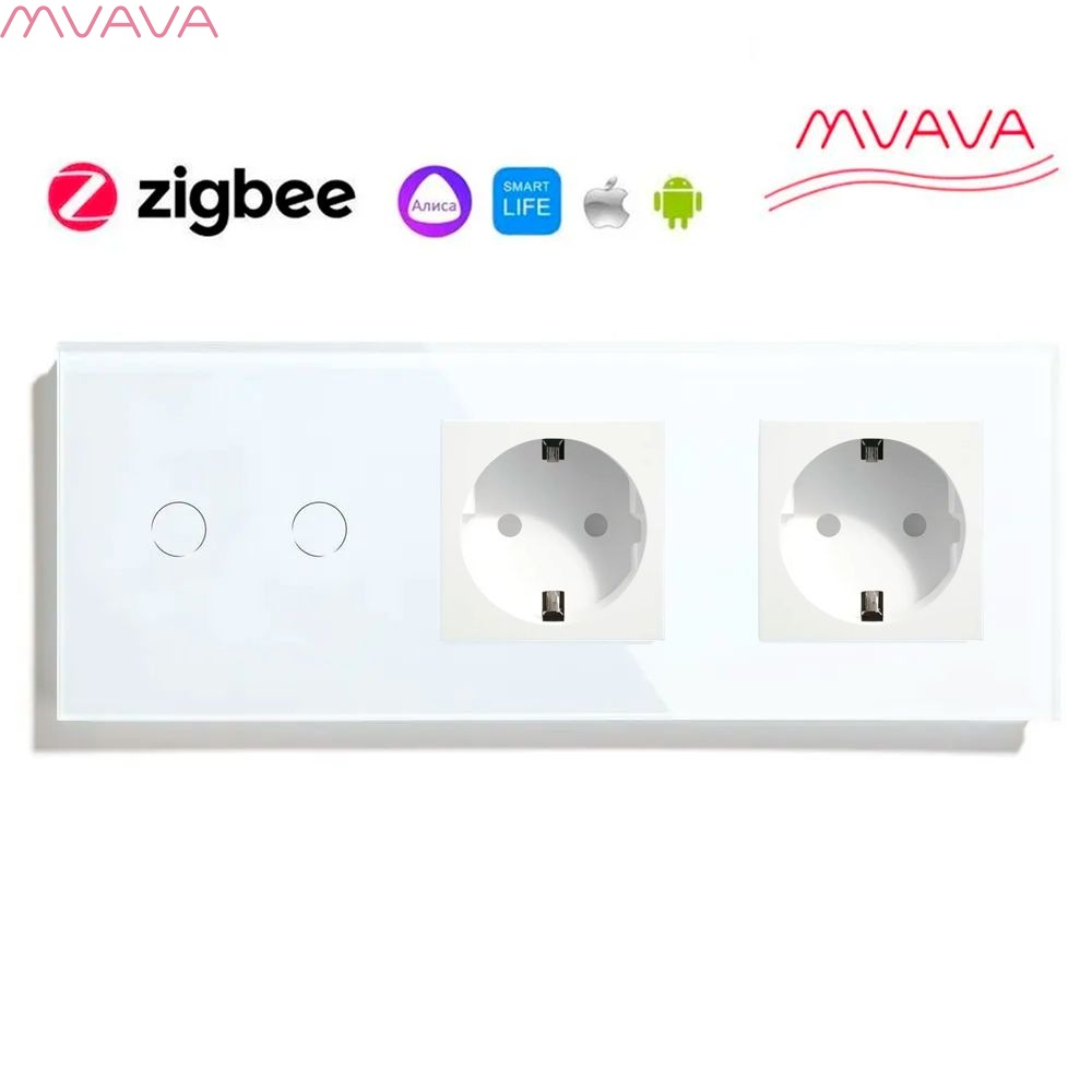 Сенсорный выключатель ZigBee MVAVA 2кл. 2 розетки, 3 поста (2G+2EU) стекло 228х86мм цвет белый