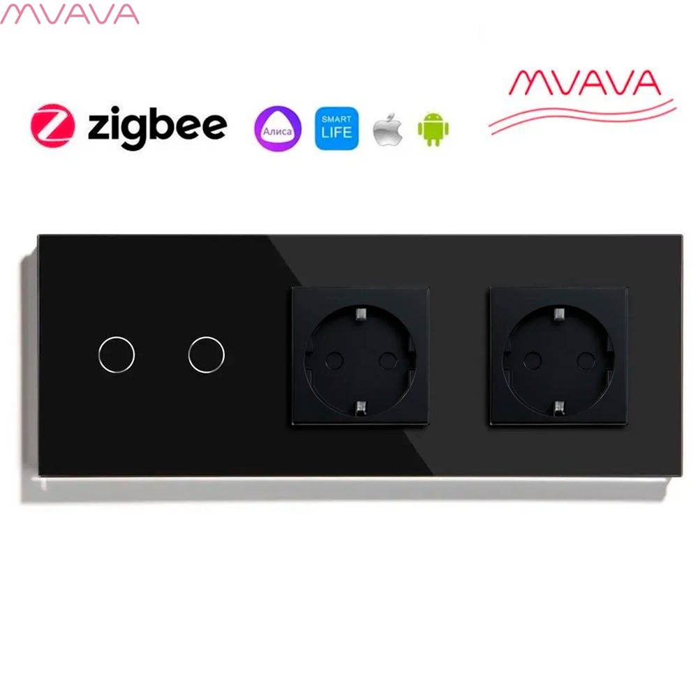 Сенсорный выключатель ZigBee MVAVA 2кл. 2 розетки, 3 поста (2G+2EU) стекло 228х86мм цвет черный