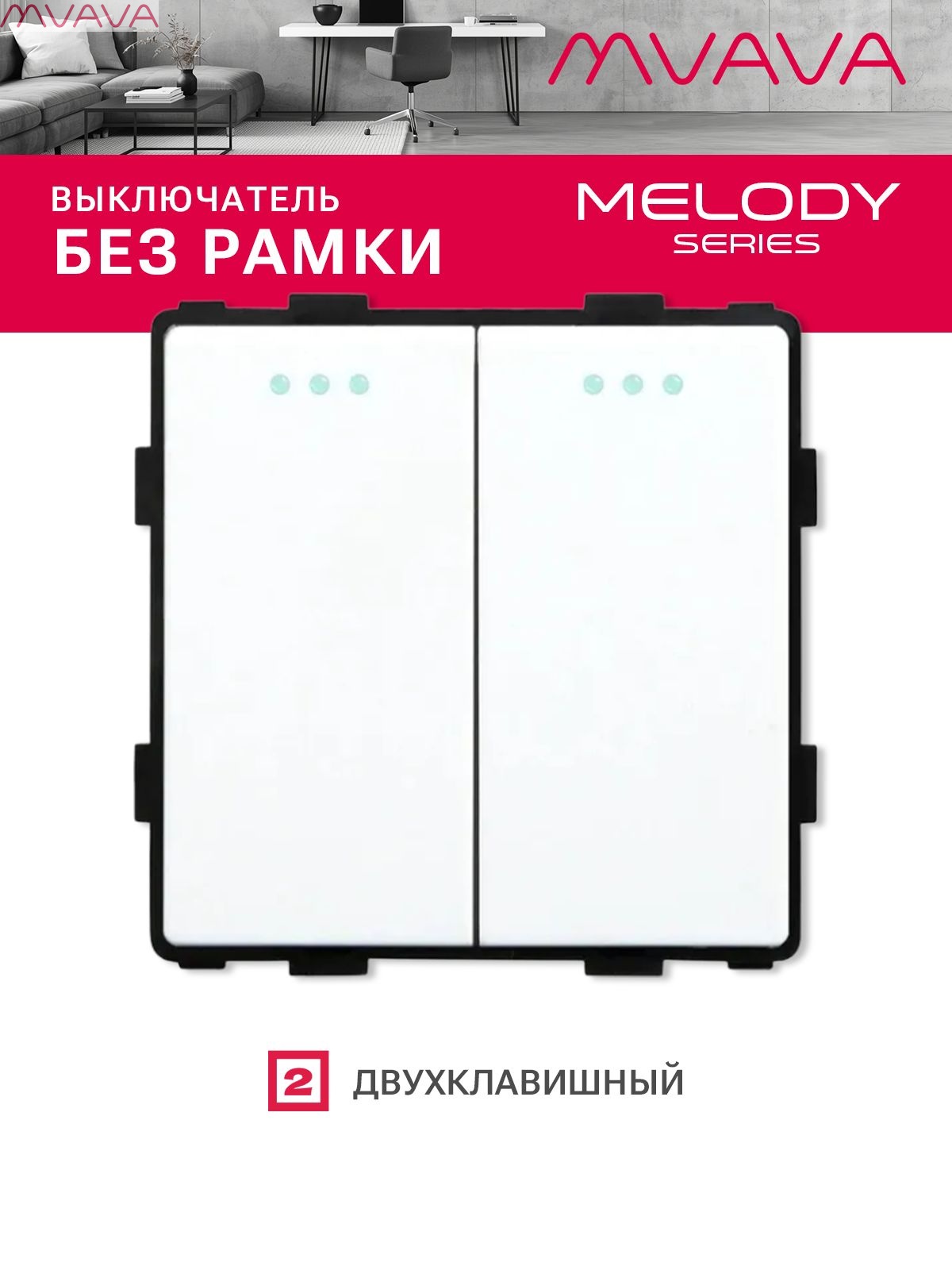 Клавишный выключатель без подсветки. Механизм выключателя без рамки, предназначен для управления двумя линиями освещения. Стандартный, не проходной, встраиваемый модульный двухклавишный выключатель 10 А, 250 В, подходит для включения и выключения светильников, люстр и других источников света. Рамка приобретается отдельно.