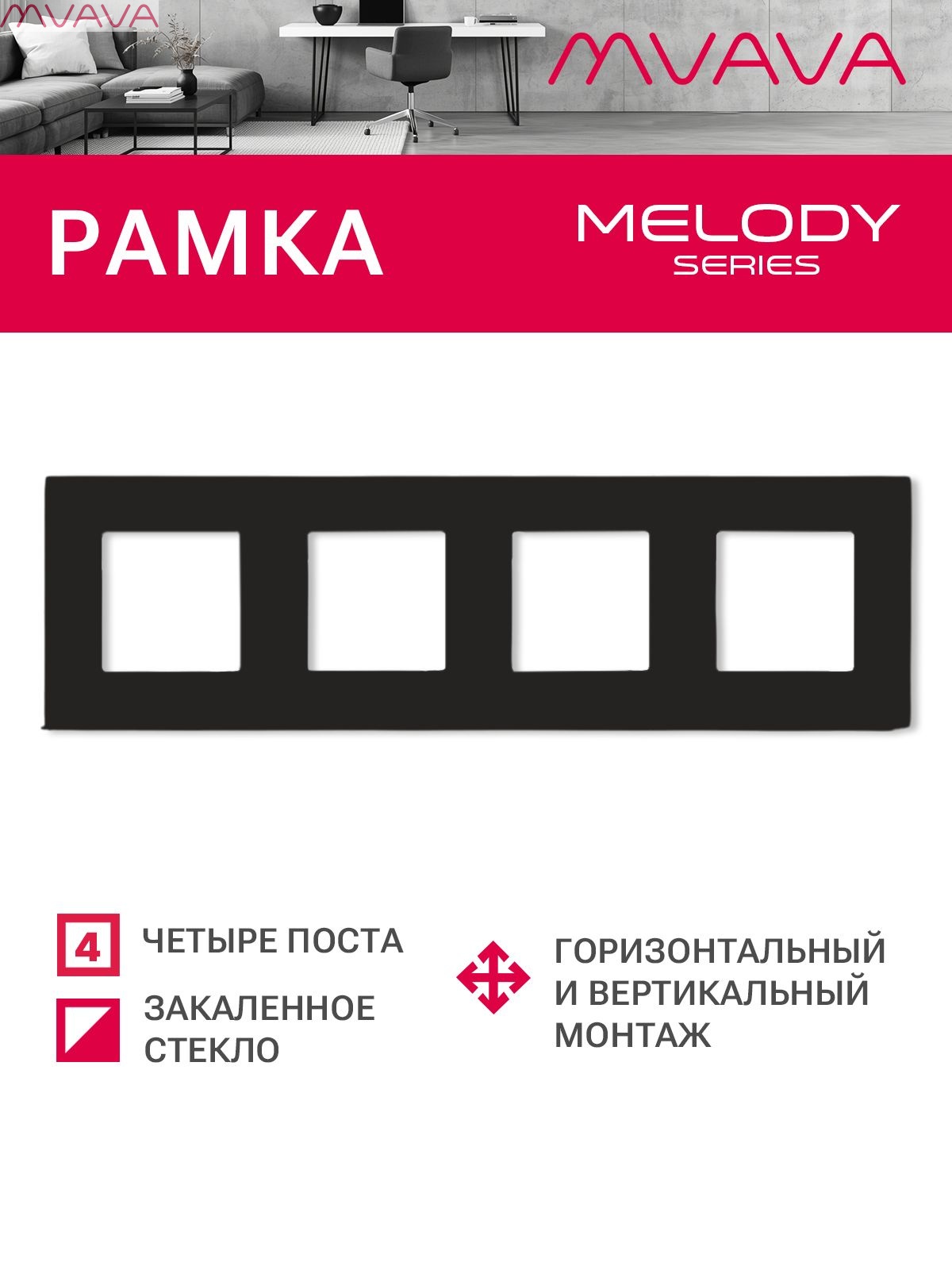 Рамка 4 поста 299*86мм, стекло, цвет черный